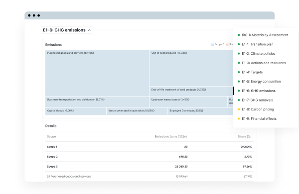 Once your data is processed, we calculate the environmental impact for each of your products and perform your GHG Protocol - compliant Carbon Accounting. We cover all environmental standards as required by the CSRD (ESRS E1-E5). To ensure the accuracy needed to build concrete roadmaps and set targets, we use activity-based data to calculate product impact.
