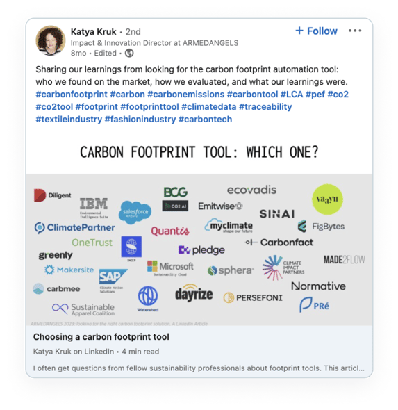 our products. Thanks to Carbonfact's focus on the apparel industry we get life cycle assessments with industry specific data for all our products in an easy way. Which helps us make the right decisions and reach our goal of reducing our emissions by 50% before 2030."